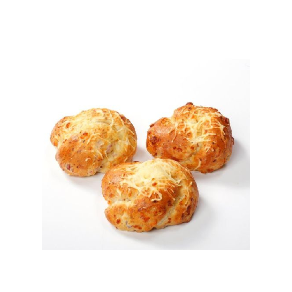 Deze hartige Knoop is bereid met bacon en kaas en heeft een topping van emmentaler kaas. is fully baked maar nog lekkerder als hij een tikkie krijgt in de oven